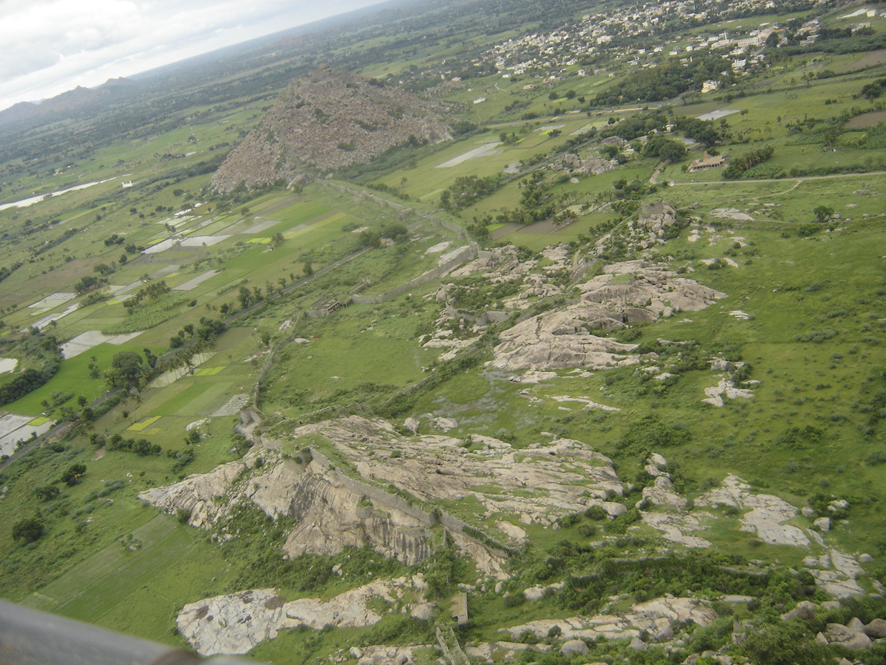The snap below shows an adjacent hill that houses one more part of the fort. When seen carefully, one can observe a wall running from the portion of the fort from which this snap has been taken to the other portion on top of the hill in the centre of the snap and then to one of the hills on the right side: