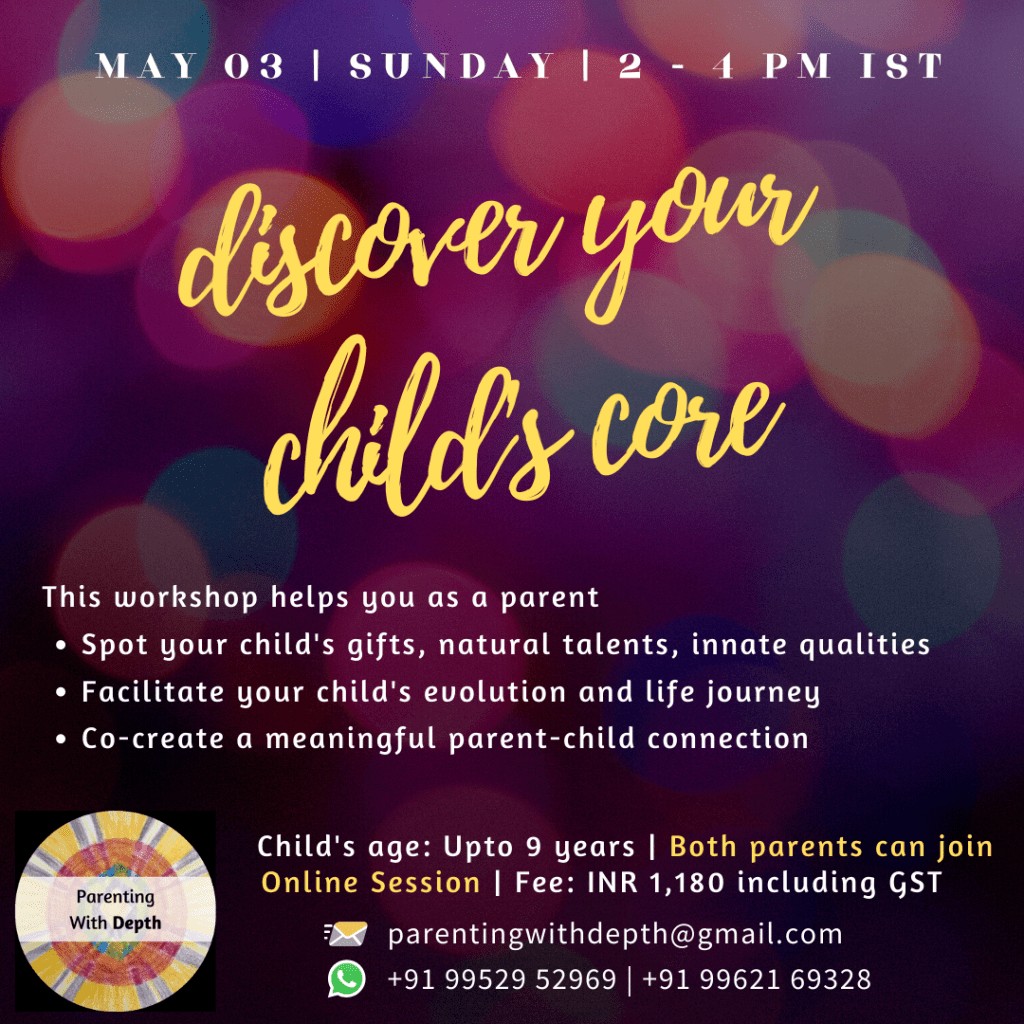 This workshop helps you discover who your child is at his/her core. This helps you facilitate your child’s evolution and life journey. It enables you to co-create a meaningful parent-child connection.